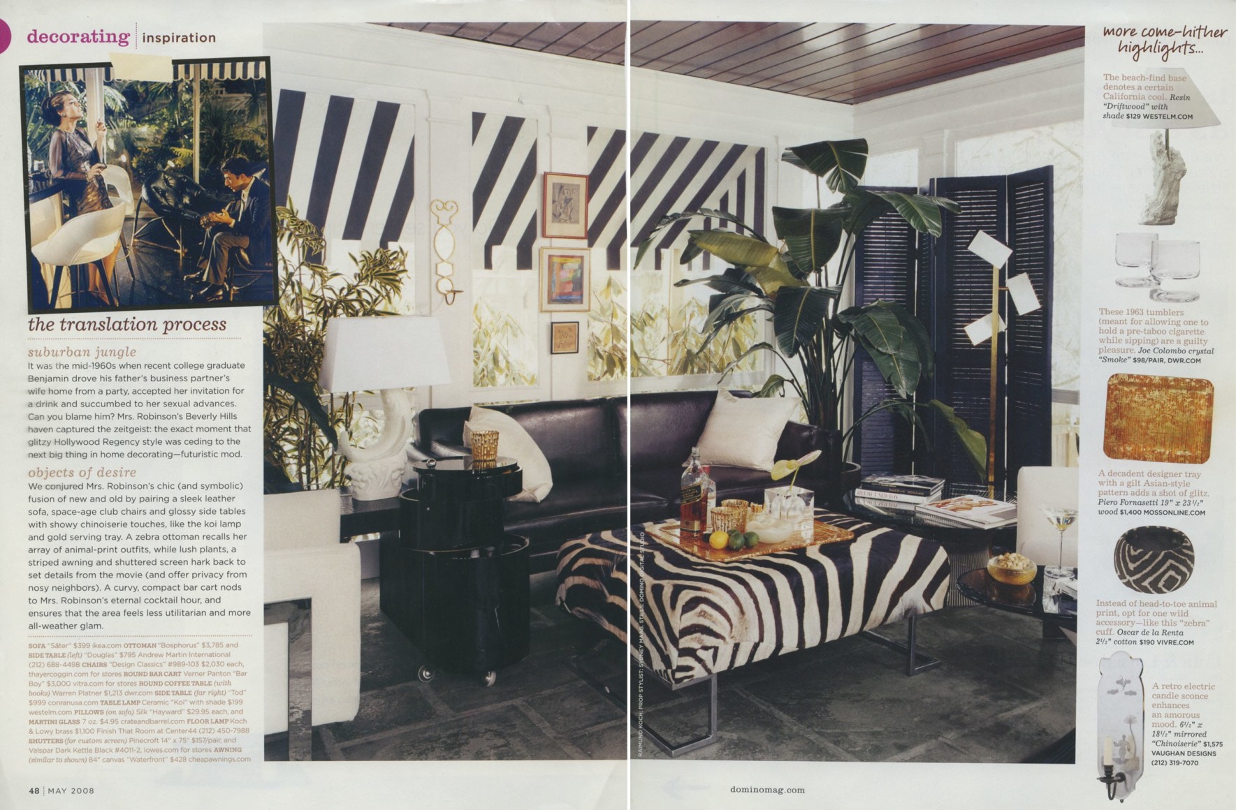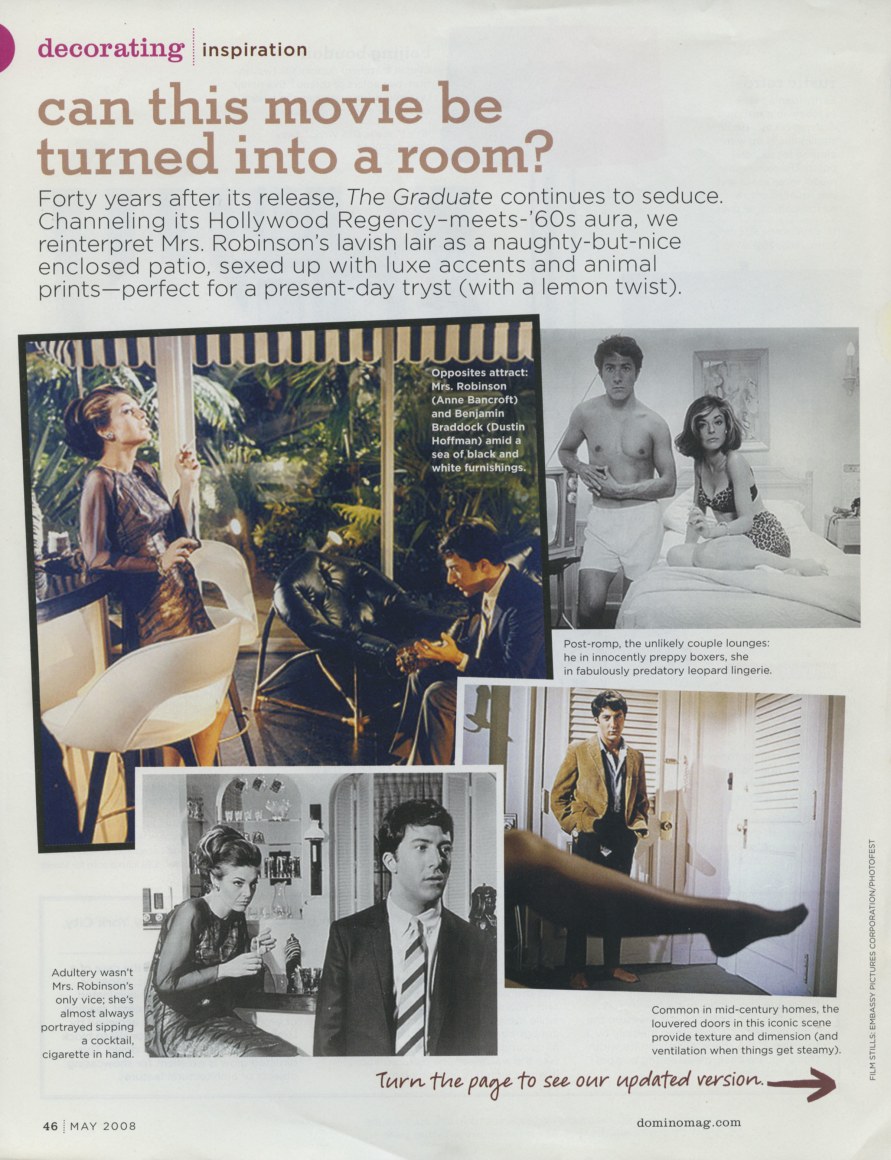 Forty years after its release, The Graduate continues to seduce. Channeling its Hollywood Regency-meets-'60s aura, we reinterpret Mrs. Robinson's lavish lair as a naughty-but-nice enclosed patio, sexed up with luxe accents and animal prints—perfect for a present-day tryst (with a lemon twist).